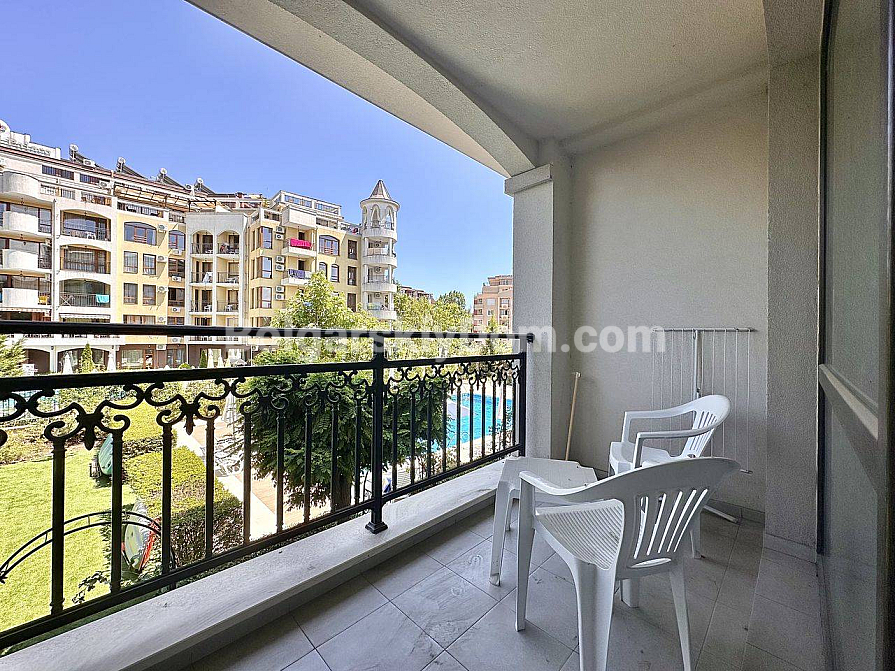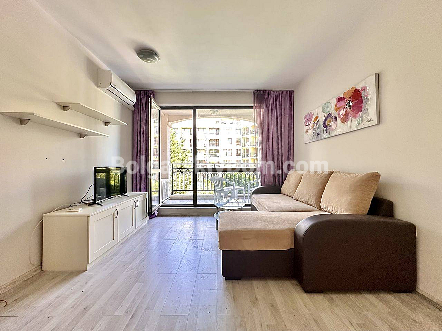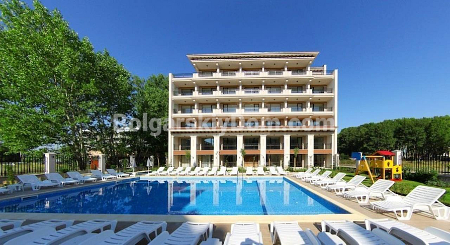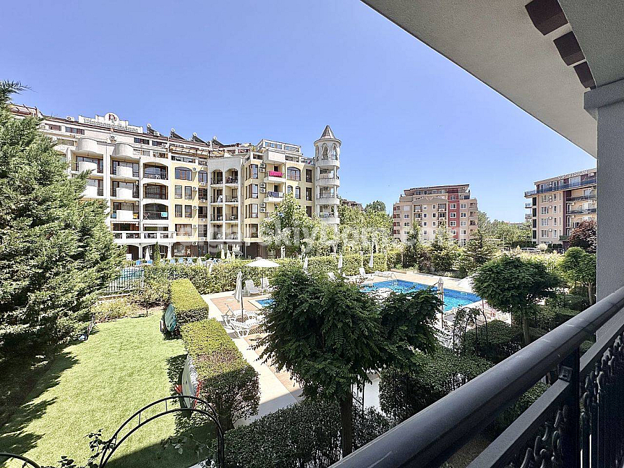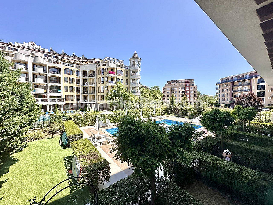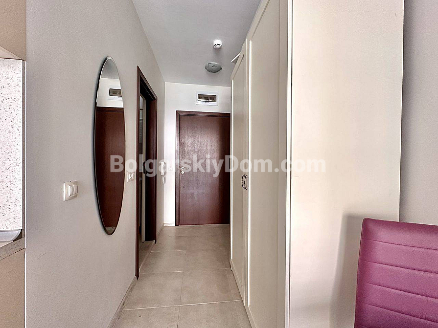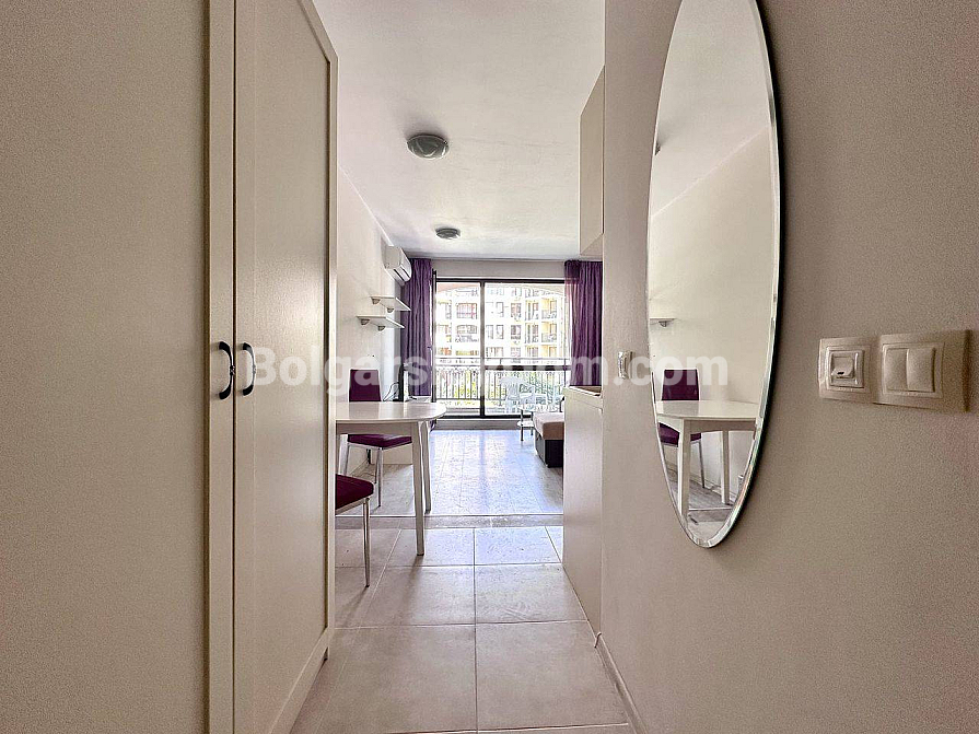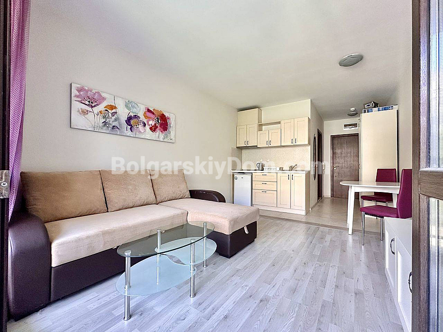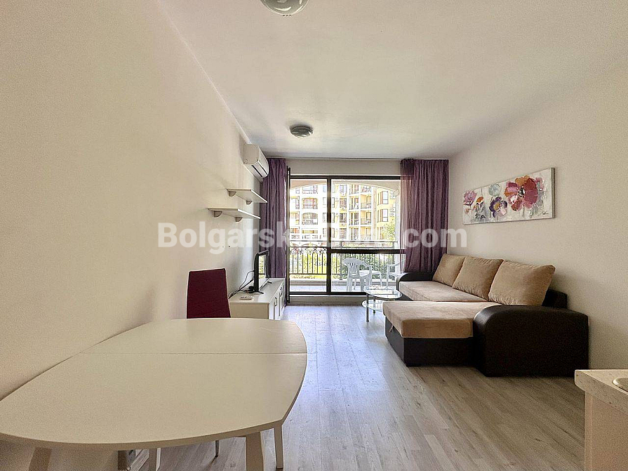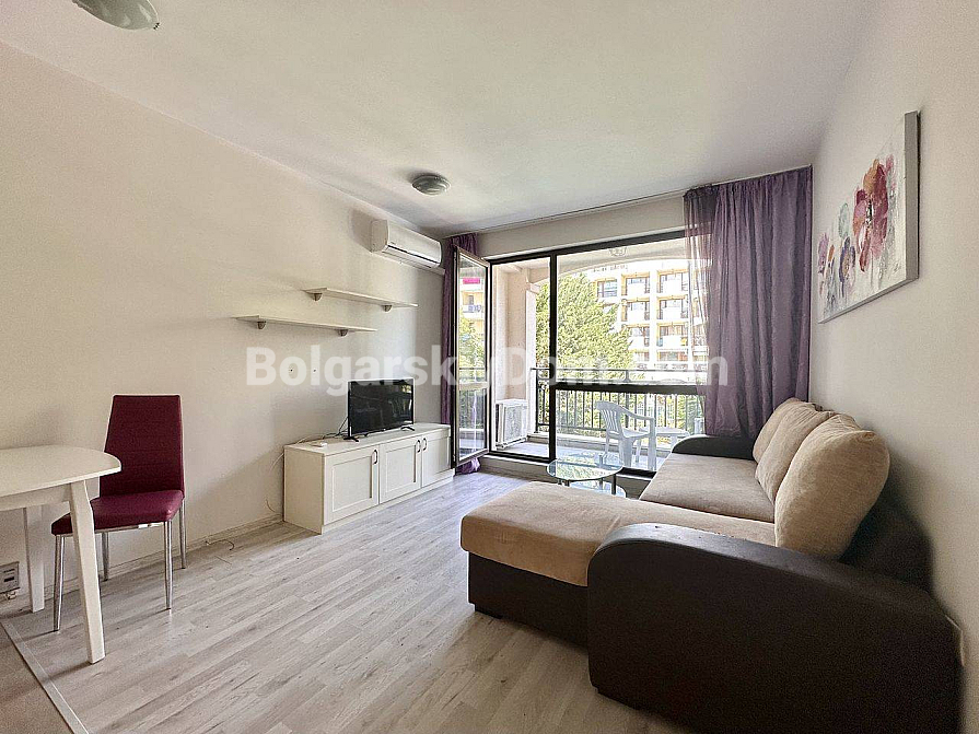 Kawalerka z widokiem na basen w południowej części Słonecznego Brzegu — gotowe rozwiązanie na wakacje i wynajem w świetnej cenie! Agencja Bolgarskiy Dom oferuje przytulną kawalerkę na sprzedaż w kompleksie „Udacha”, położonym w spokojnej, południowej części kurortu, zaledwie 700 metrów od morza. Mieszkanie znajduje się na drugim piętrze (budynek z windą), sprzedawane jest z meblami i sprzętem AGD, całkowicie gotowe do zamieszkania. Powierzchnia — 39,56 m², standardowy układ: przedpokój, aneks kuchenny z częścią wypoczynkową, balkon z widokiem na basen. Akt 16, taryfa mieszkaniowa za prąd — brak ukrytych kosztów.