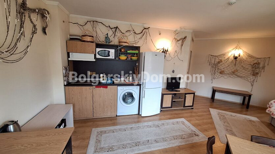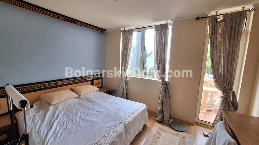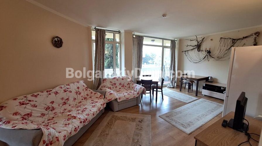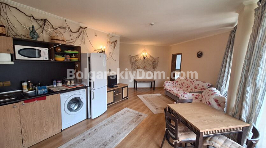 Przestronny dwupokojowy apartament o powierzchni 82 m² znajduje się w kompleksie Atrium Beach w kurorcie Elenite, zaledwie 40 m od piaszczystej, złotej plaży. Nieruchomość usytuowana jest na drugim piętrze budynku i oferuje funkcjonalny układ: przestronny przedpokój, jasny salon z aneksem kuchennym, osobną sypialnię, łazienkę z wanną oraz dwa tarasy z pięknym widokiem na morze. Południowa ekspozycja i panoramiczne okna wypełniają mieszkanie światłem, tworząc przytulną atmosferę. Apartament jest w pełni umeblowany i gotowy do zamieszkania.