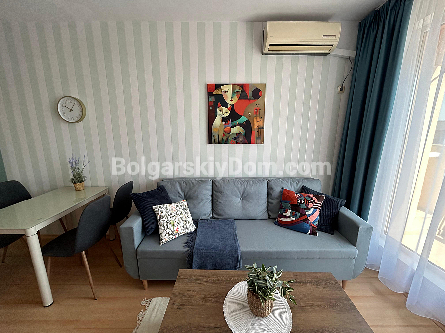 Nowoczesne dwupokojowe mieszkanie w kompleksie “Sunny Day 6”, Słoneczny Brzeg Na sprzedaż przytulne i stylowo urządzone mieszkanie o powierzchni 54 m², położone na 4. piętrze (bez windy) w popularnym kompleksie “Sunny Day 6”. Kompleks znajduje się zaledwie 4 km od plaży i centrum kurortu Słoneczny Brzeg. Okolica oferuje dobrze rozwiniętą infrastrukturę i dogodne połączenia komunikacyjne, co zapewnia komfortowe warunki życia. Mieszkanie składa się z przestronnego salonu z aneksem kuchennym, oddzielnej sypialni, łazienki oraz balkonu. Nieruchomość jest w pełni umeblowana i wyposażona w sprzęt AGD, gotowa do zamieszkania lub wynajmu.