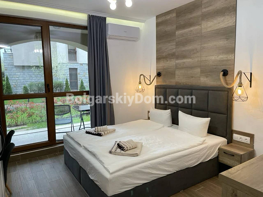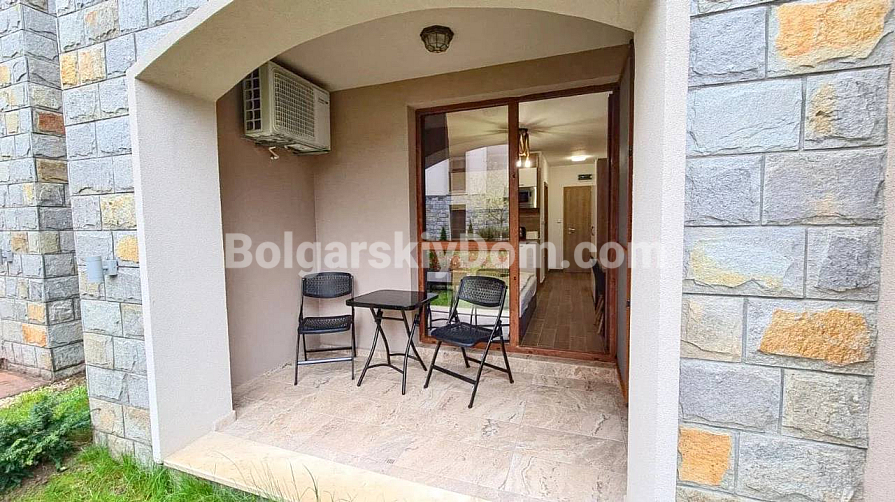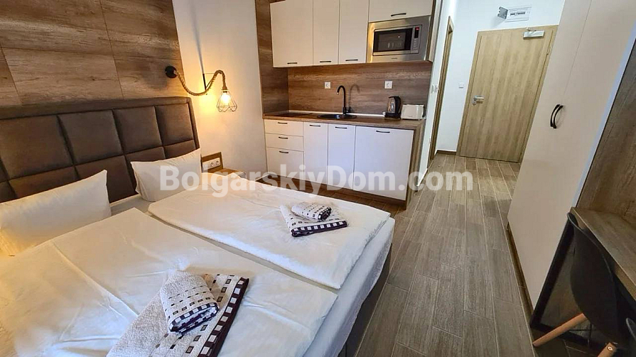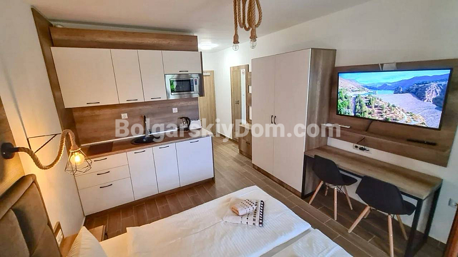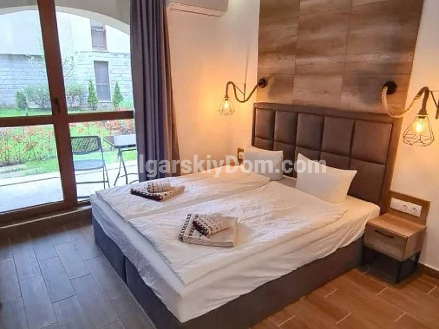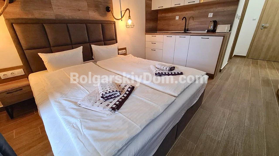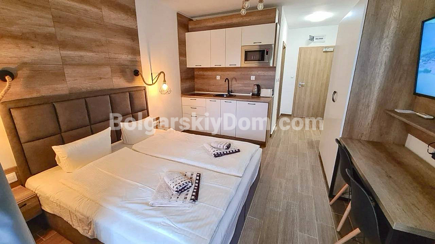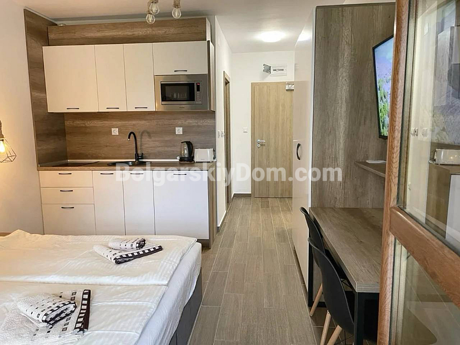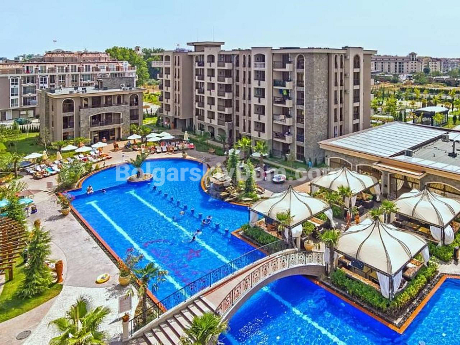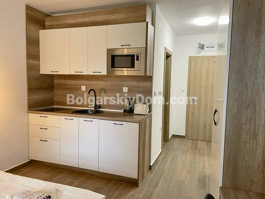 W luksusowym kompleksie Cascadas w Słonecznym Brzegu, uważanym za jeden z najbardziej prestiżowych i popularnych, na sprzedaż oferowane jest stylowe mieszkanie typu studio z nowym remontem. To przytulne lokum o powierzchni 36 m², położone na parterze, urządzone zostało w ciepłych, drewnianych tonacjach. Apartament wyposażony jest we wszystko, co niezbędne do komfortowego życia: duże łóżko małżeńskie z miękkim zagłówkiem, nowoczesny aneks kuchenny z kuchenką, mikrofalówką i pełnym zestawem naczyń. Do dyspozycji jest także strefa do pracy z telewizorem, nowoczesna łazienka, klimatyzacja oraz szybki internet Wi-Fi. Mieszkanie łączy domowy komfort z wysokim standardem usług, idealnie nadaje się dla par, rodzin lub podróży służbowych.