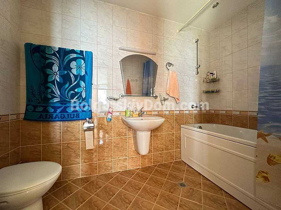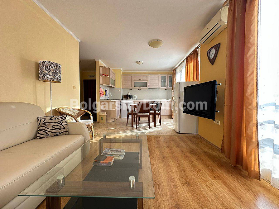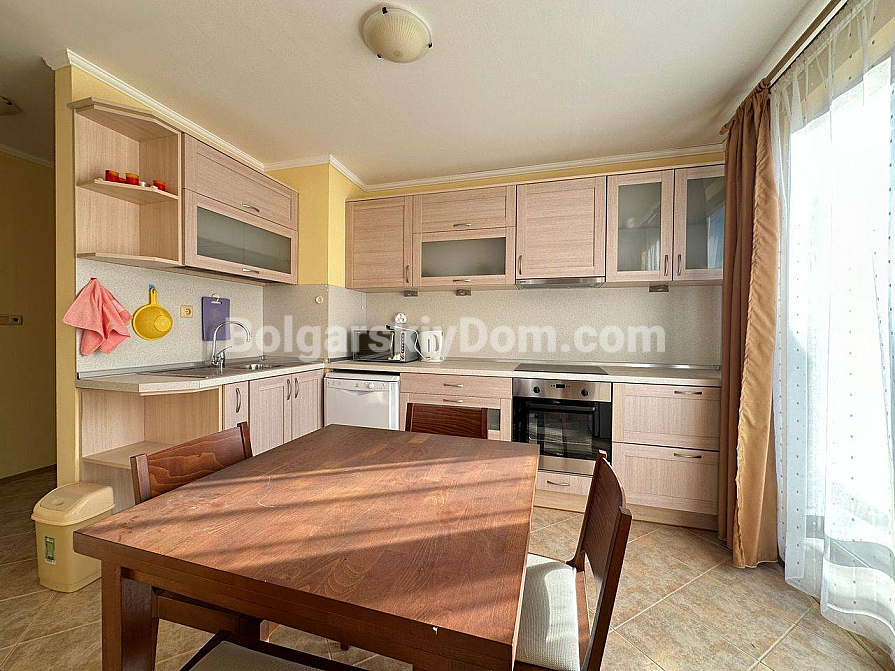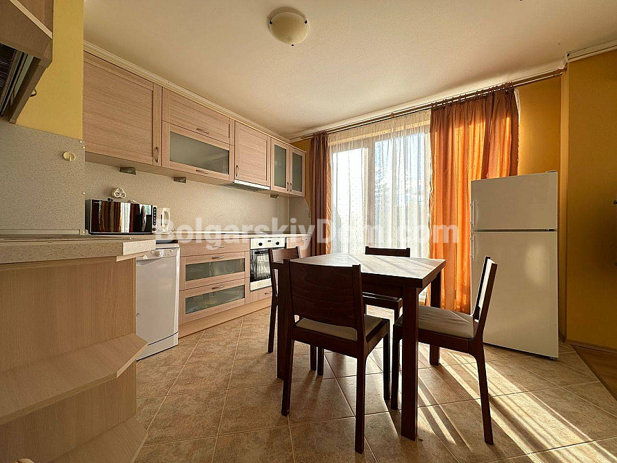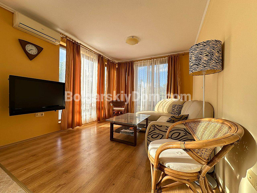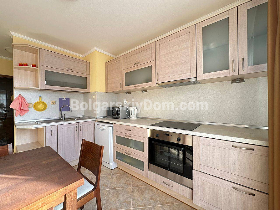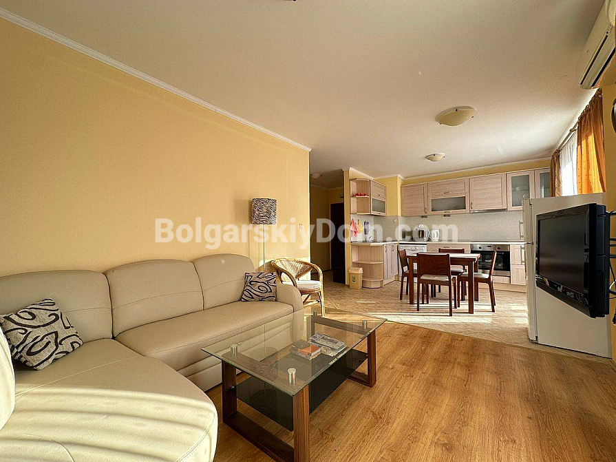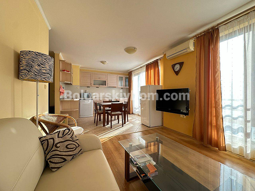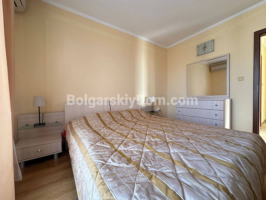 Przedstawiamy Państwu stylowe i jasne mieszkanie o powierzchni 70 m², zaledwie 100 metrów od morza. Znajduje się ono na drugim piętrze przytulnego czteropiętrowego kompleksu w Byala. Co wyróżnia ten apartament? Po pierwsze, przestronny salon sprytnie podzielony na część wypoczynkową i dużą kuchnię z jadalnią. Po drugie, dużo okien – mieszkanie jest zawsze jasne i przytulne. Ponadto posiada dwa tarasy: jeden w salonie z widokiem na basen, drugi w sypialni – wychodzący na zieleń z bocznym widokiem na morze. Wygodna łazienka z wanną. Niewielki przedpokój. Mieszkanie jest umeblowane i wyposażone w sprzęt AGD.