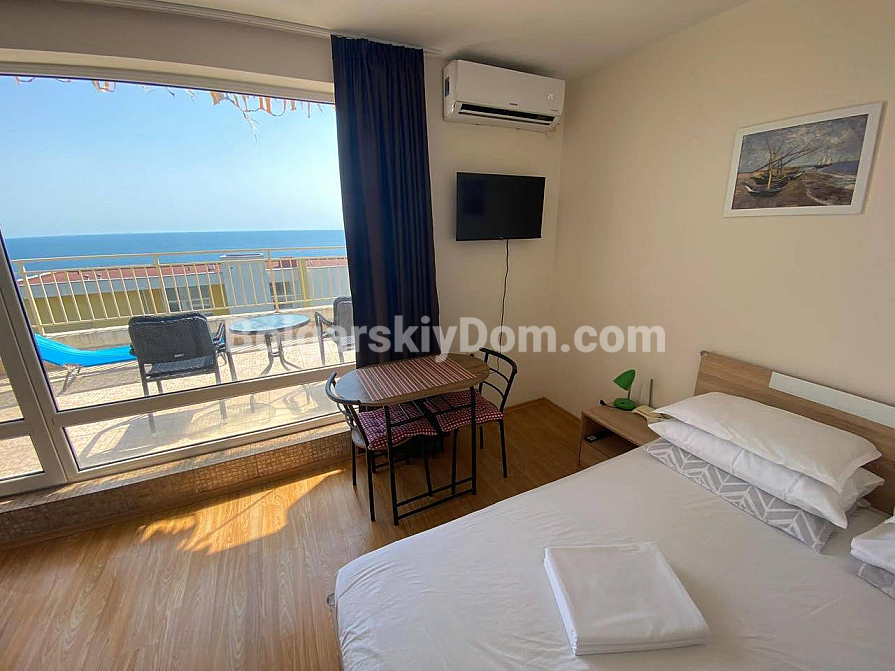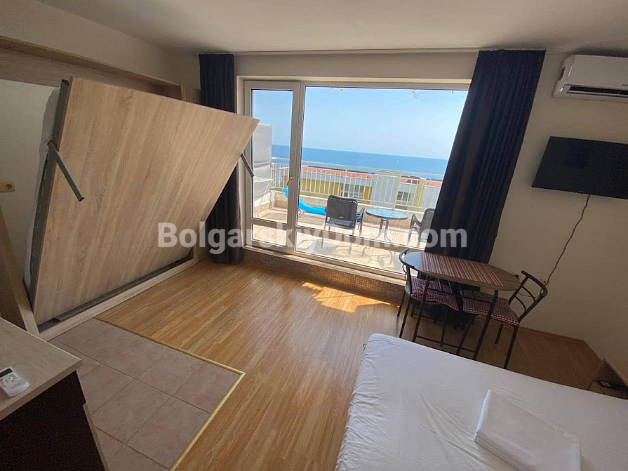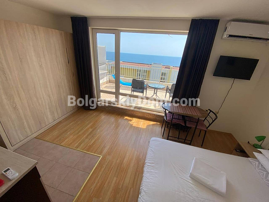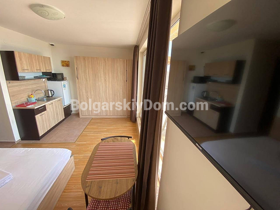 Uwaga, uwaga! Agencja nieruchomości Bolgarskiy Dom oferuje Państwu nie tylko mieszkanie, ale abonament w największym kompleksie wypoczynkowym w Świętym Własie! To kawalerka w Crown Fort Club – części imponującego Fort Noks Grand Resort – z oszałamiającym panoramicznym widokiem na morze. Apartament o powierzchni 48 m² znajduje się na szóstym piętrze i jest w pełni gotowy na Państwa przyjazd. Przestrzeń mieszkalna została zaprojektowana z największą starannością: komfortowa strefa z podwójnym łóżkiem i stołem jadalnym, kompaktowa kuchnia w jasnych tonach, wyposażona we wszystkie niezbędne sprzęty (lodówka, kuchenka mikrofalowa), a także przestronna łazienka. Główną atrakcją jest duży taras z bezpośrednim widokiem na morze, na którym znajdują się już wygodne fotele i leżak. Zainstalowano klimatyzację oraz pojemną szafę do przechowywania.