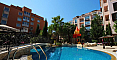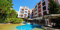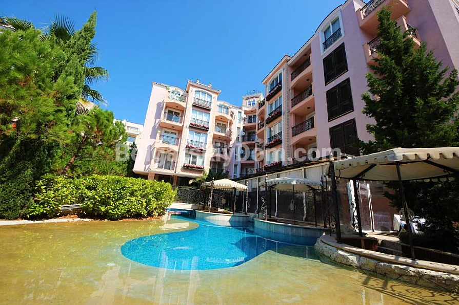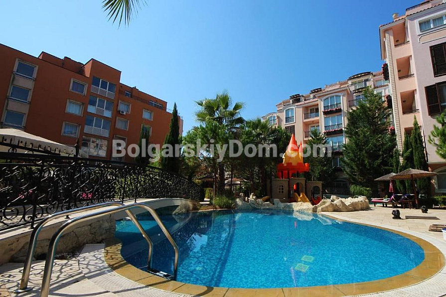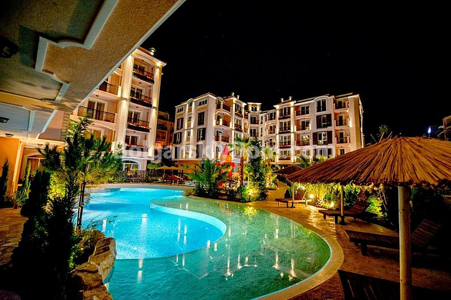 Kompleks *Romance Marine* położony jest w wygodnej części Słonecznego Brzegu: do szerokiej, piaszczystej plaży tylko 400 metrów — 5–7 minut spacerem. Na terenie panuje świetna atmosfera do wypoczynku: duży basen z zjeżdżalnią i częścią dla dzieci, altanki i strefy relaksu otoczone zielenią. Lokalizacja idealna do życia: całoroczny supermarket w pobliżu, przystanek autobusowy w dwie minuty, a historyczne Stare Miasto Nessebar zaledwie 20 minut spacerem. Połączenie wygody, bliskości morza i doskonałej infrastruktury przy rozsądnej opłacie eksploatacyjnej 15 euro za metr kwadratowy.