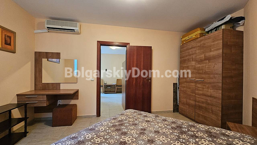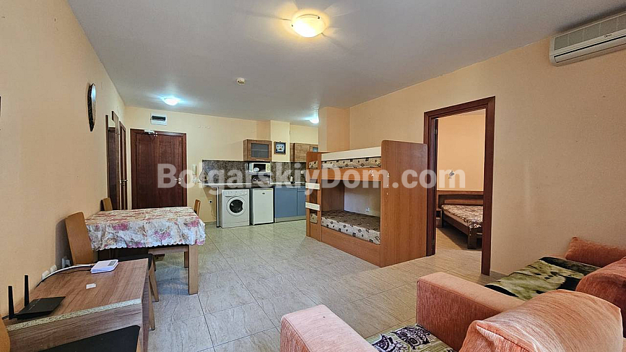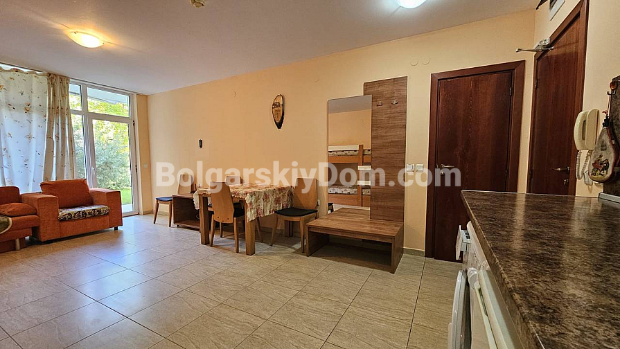 Po co marzyć o domku z ogrodem, skoro można mieć jego wakacyjną wersję – z widokiem na trawnik i basen? Firma Bolgarskiy Dom prezentuje dwupokojowe mieszkanie o powierzchni 50 m² w kompleksie Sun Village. Apartament znajduje się na parterze i ma ogromną zaletę: przestronny taras z bezpośrednim wyjściem na zadbany trawnik – idealne miejsce na poranną kawę. Układ jest klasyczny i wygodny: salon z aneksem kuchennym, osobna sypialnia i nowoczesna łazienka. Mieszkanie sprzedawane jest w pełni umeblowane, w dobrym stanie i gotowe do natychmiastowego zamieszkania. Czekamy na Twój telefon!
