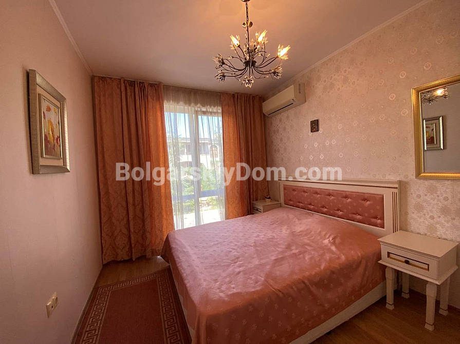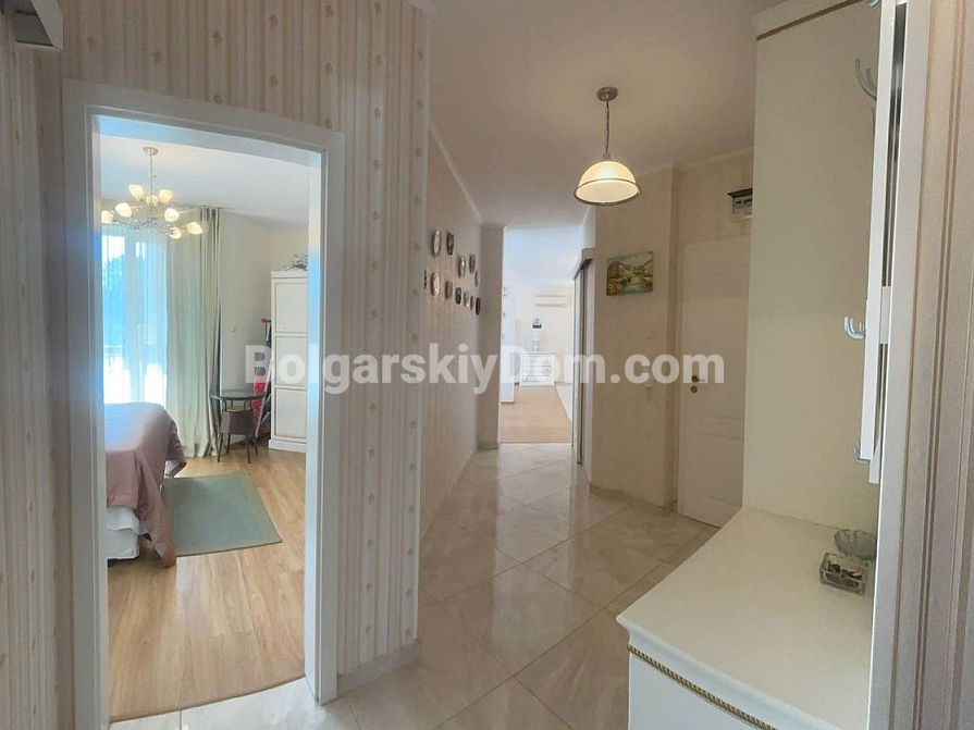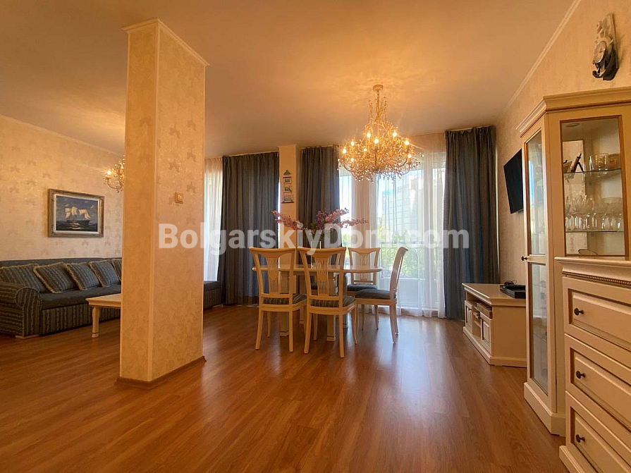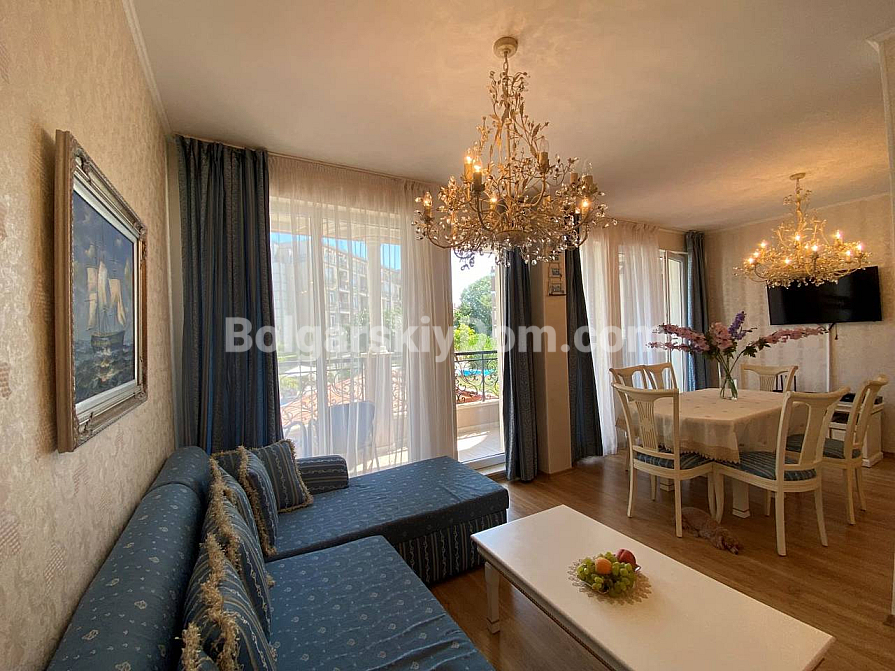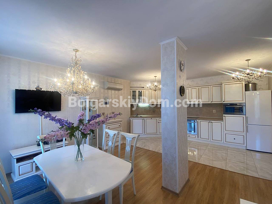 Wzór elegancji i dobrego smaku o powierzchni 118 m² – trzypokojowe mieszkanie w luksusowym, zamkniętym kompleksie w centralnej części Słonecznego Brzegu. Apartament znajduje się na drugim piętrze mieszkalnym i zachwyca funkcjonalnym układem oraz nienagannym stylem. Składa się z przestronnego korytarza, jasnego salonu z częścią wypoczynkową i dużą kuchnią w stylu retro, dwóch elegancko urządzonych sypialni oraz dwóch łazienek. Przedpokój, łazienki i część kuchenna posiadają ogrzewanie podłogowe. Z panoramicznego tarasu roztacza się widok na zielony teren i dwa baseny. Mieszkanie sprzedawane jest w pełni umeblowane i wyposażone technicznie, gotowe zarówno do zamieszkania, jak i do dochodowego wynajmu w sezonie letnim lub zimowym.