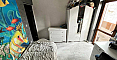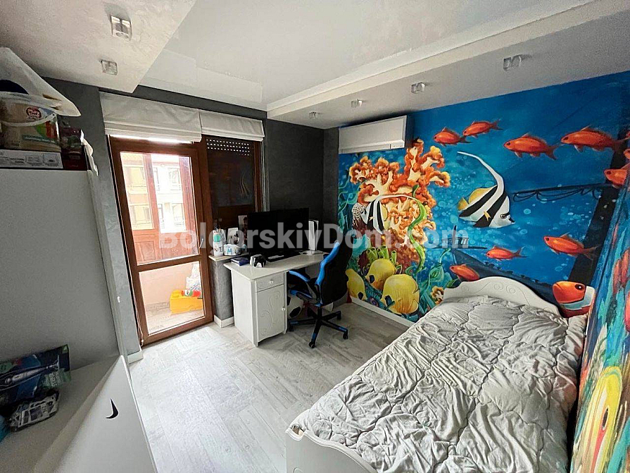 Apartament jest w pełni umeblowany i wykończony z użyciem materiałów najwyższej jakości: włoskie meble, dekoracyjne tynki, sufity napinane, szklane drzwi, gres i parkiet. Układ jest idealny dla rodziny — przestronny salon z kuchnią, dwa zabudowane tarasy, sypialnia z garderobą i prywatną łazienką oraz pokój dziecięcy z własną łazienką. Ogrzewanie zapewniają niezawodne klimatyzatory Mitsubishi. Odległość do morza wynosi zaledwie 500 metrów.