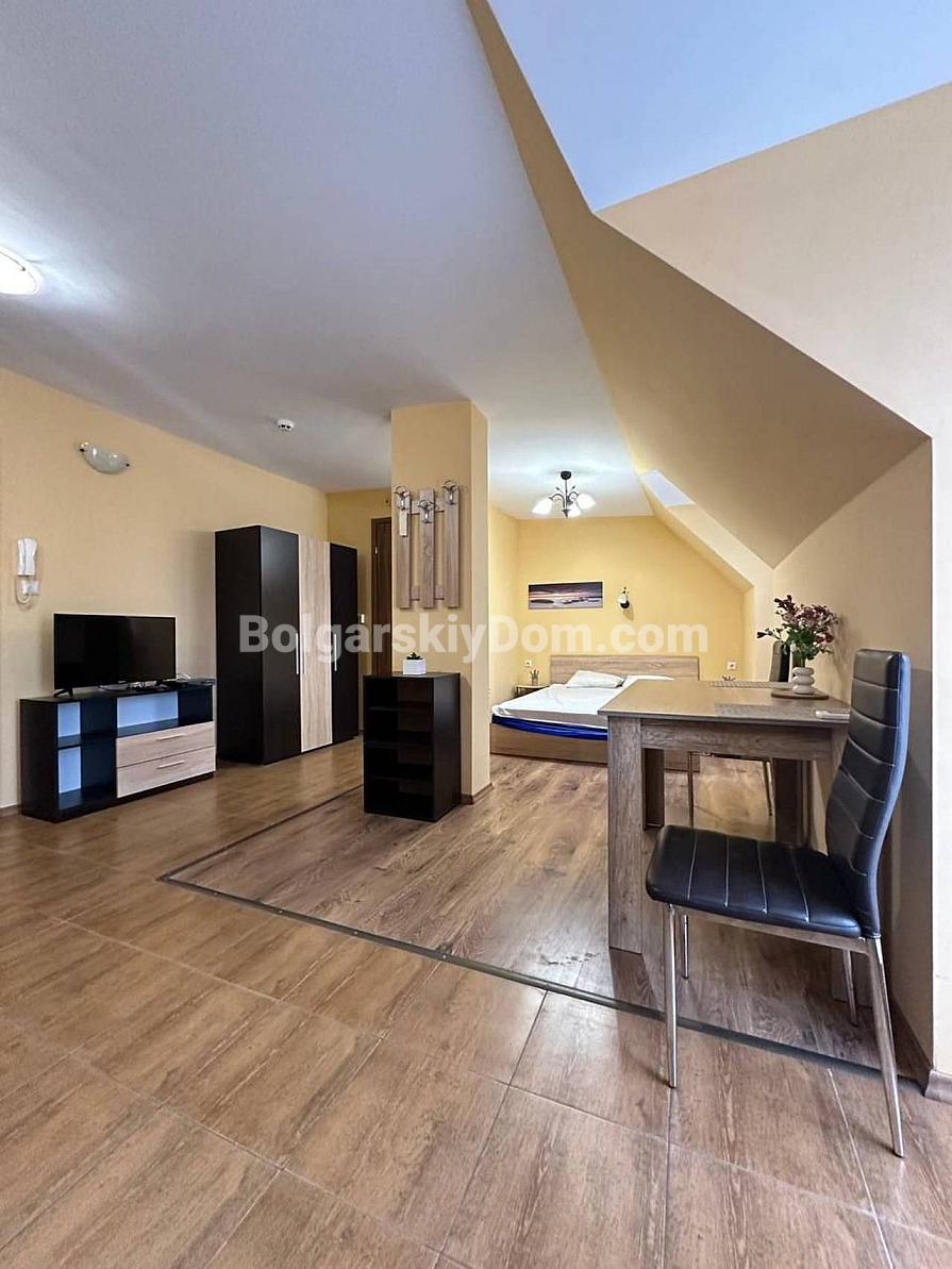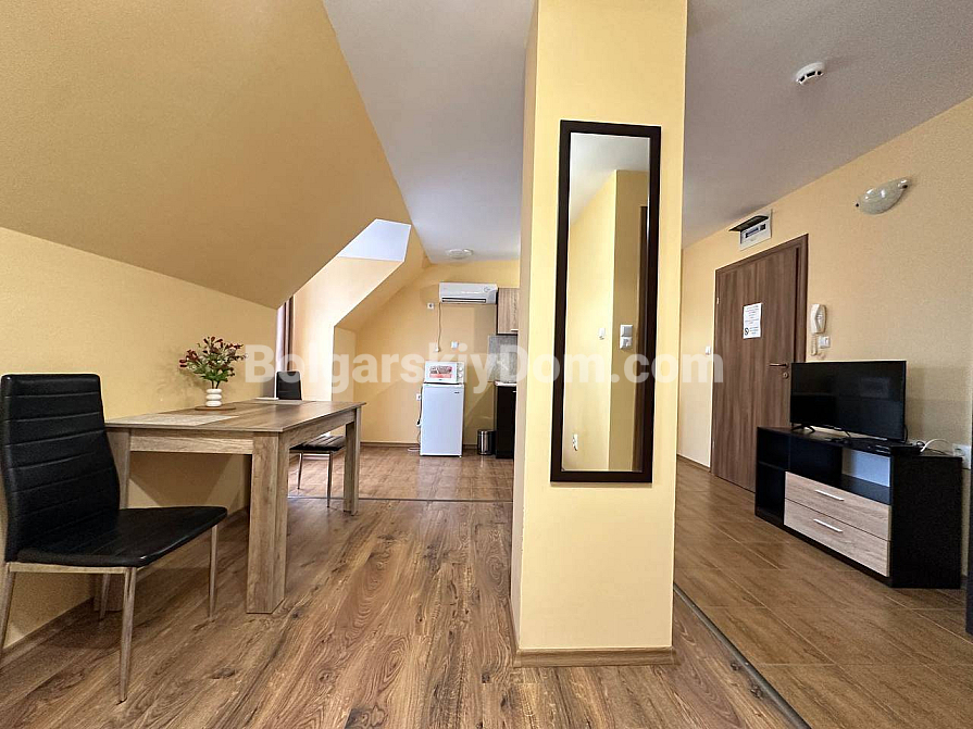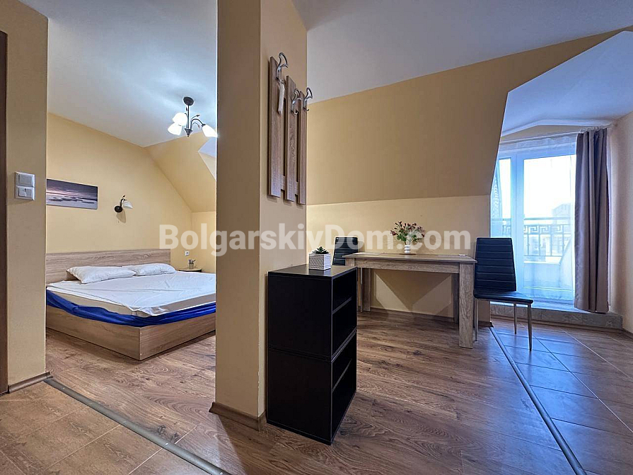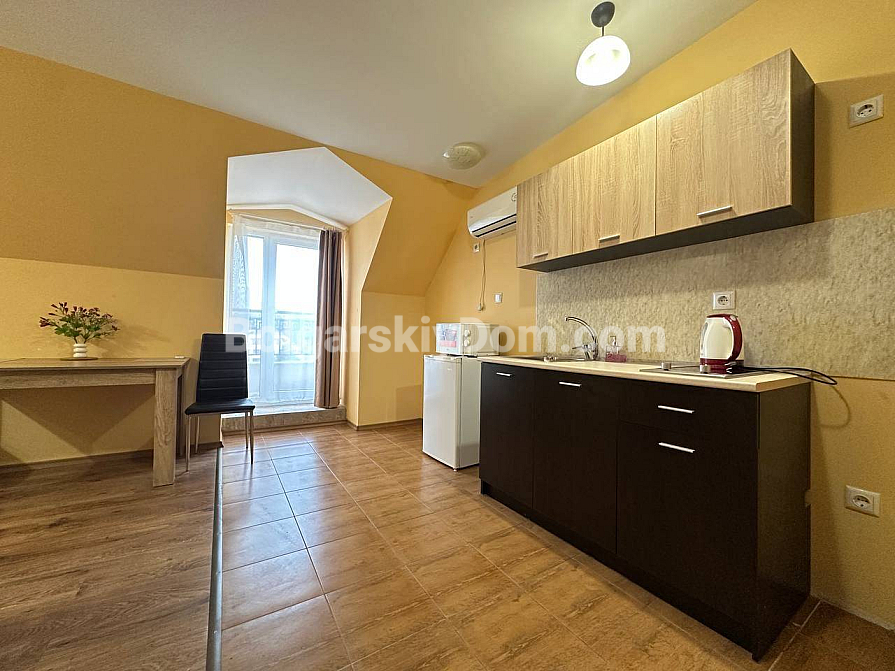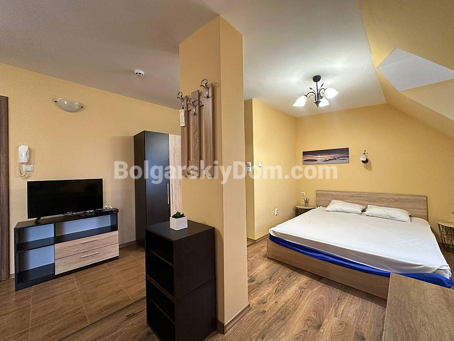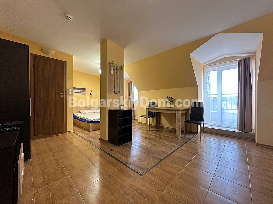 Światło, przestrzeń i widok na morze — studio z własnym charakterem w kompleksie Horizon, położonym w spokojnej, zielonej dzielnicy między Słonecznym Brzegiem a Świętym Własem. To mieszkanie na ostatnim, piątym piętrze to nie tylko metry kwadratowe, ale przestrzeń z nastrojem. Powierzchnia 40 m² jest przemyślana w każdym detalu: okrągły układ nadaje lekkości i płynności. Po prawej stronie znajduje się kompaktowa część kuchenna. Po lewej, w przytulnej wnęce za kolumną — strefa sypialniana, prywatny kącik wypoczynku. Pomiędzy nimi — jadalnia, która harmonijnie łączy przestrzeń i sprawia, że mieszkanie jest naprawdę przytulne. A za szklanymi drzwiami — mały taras z widokiem, od którego trudno oderwać wzrok: morze i szeroki horyzont.