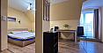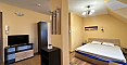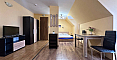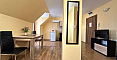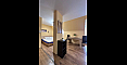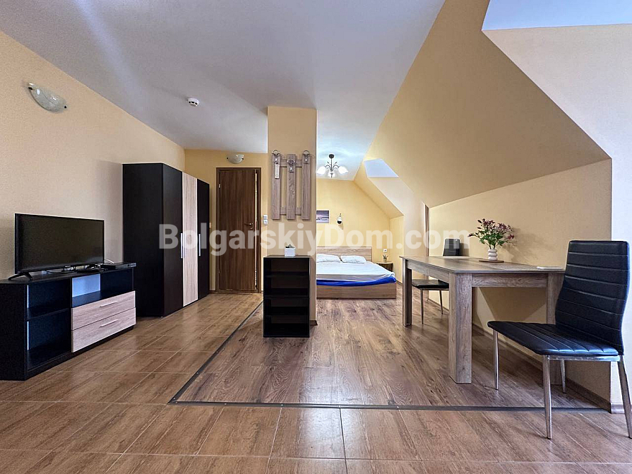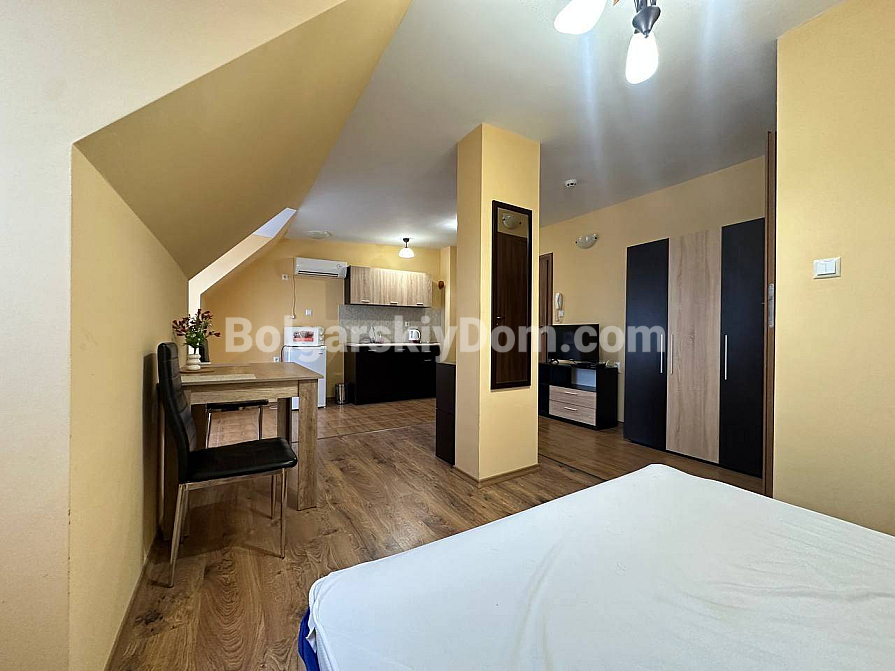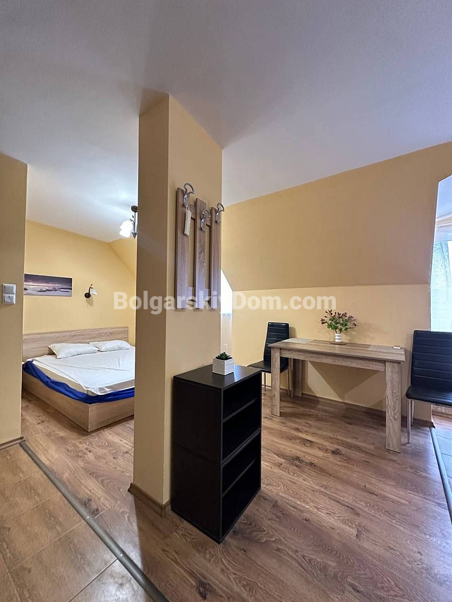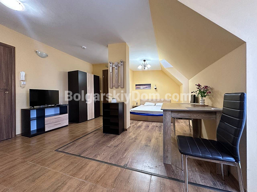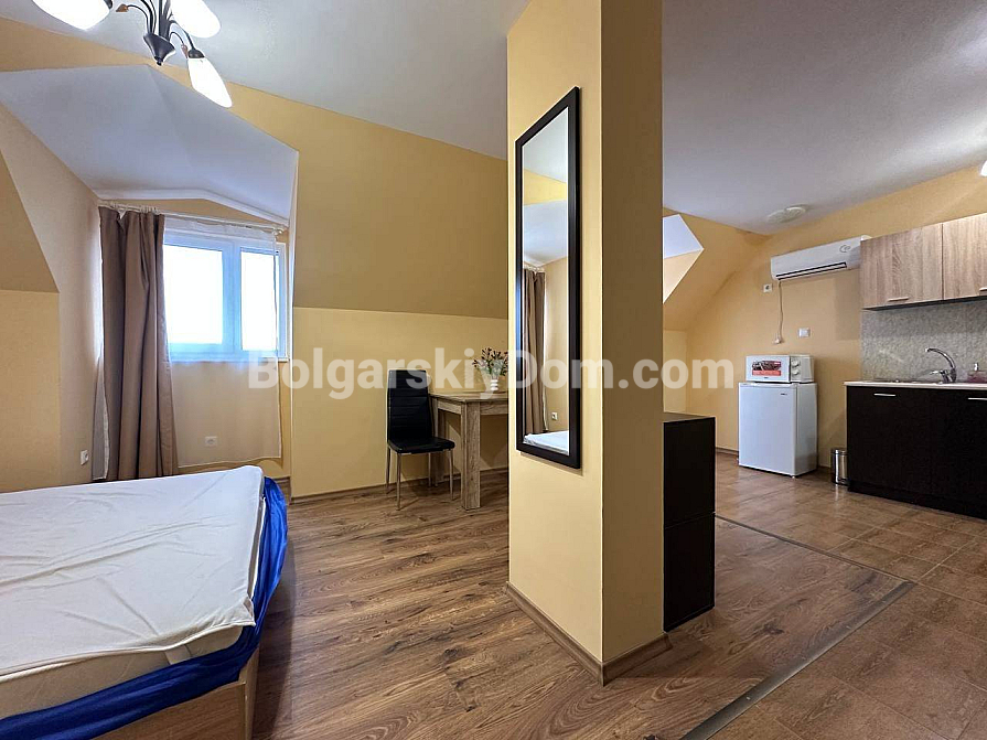 Światło, przestrzeń i widok na morze — studio z własnym charakterem w kompleksie Horizon, położonym w spokojnej, zielonej dzielnicy między Słonecznym Brzegiem a Świętym Własem. To mieszkanie na ostatnim, piątym piętrze to nie tylko metry kwadratowe, ale przestrzeń z nastrojem. Powierzchnia 40 m² jest przemyślana w każdym detalu: okrągły układ nadaje lekkości i płynności. Po prawej stronie znajduje się kompaktowa część kuchenna. Po lewej, w przytulnej wnęce za kolumną — strefa sypialniana, prywatny kącik wypoczynku. Pomiędzy nimi — jadalnia, która harmonijnie łączy przestrzeń i sprawia, że mieszkanie jest naprawdę przytulne. A za szklanymi drzwiami — mały taras z widokiem, od którego trudno oderwać wzrok: morze i szeroki horyzont.