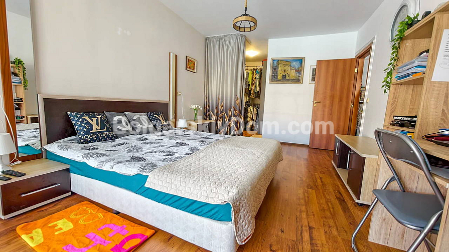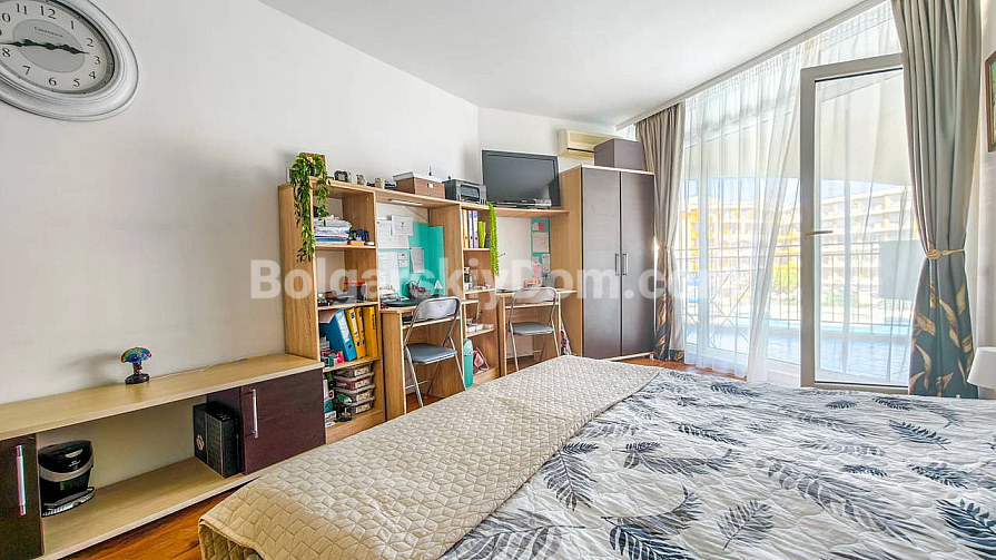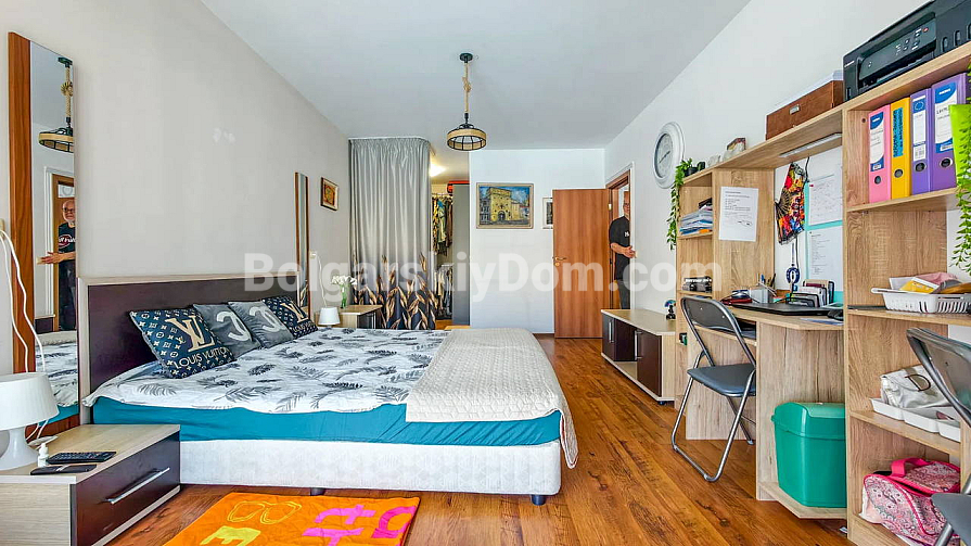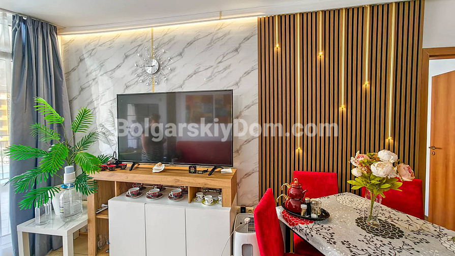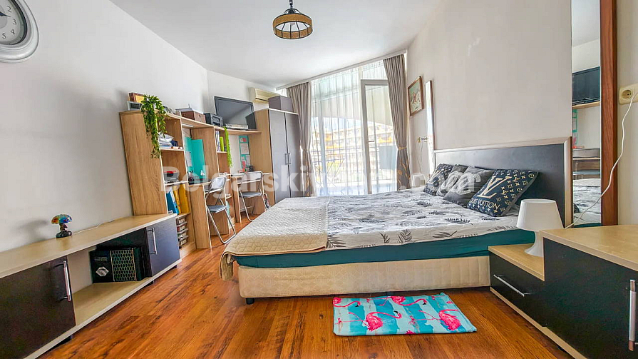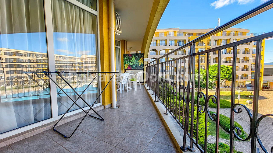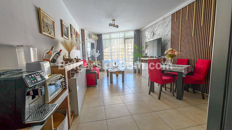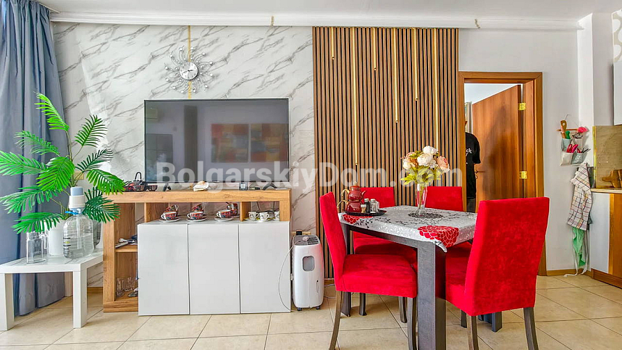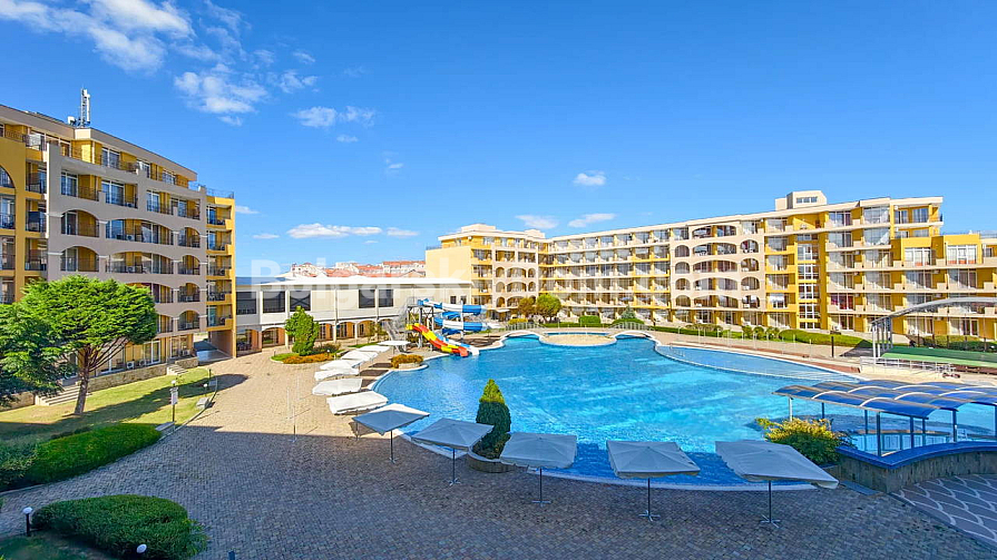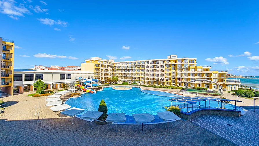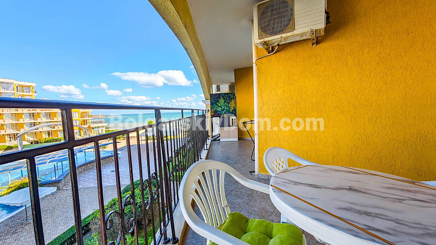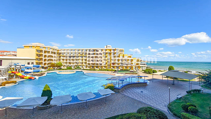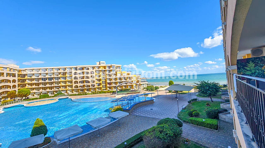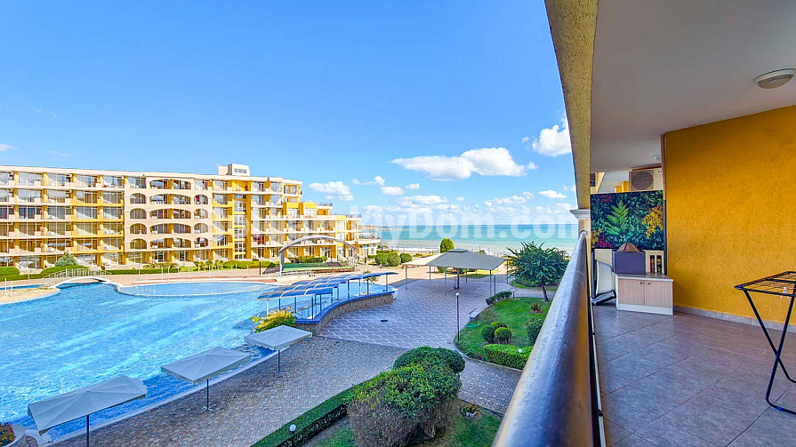 Topowa nowość w katalogu nieruchomości z widokiem na morze! Agencja Bolgarski Dom prezentuje przestronne dwupokojowe mieszkanie o powierzchni 72 m² z niezwykle pięknym widokiem na morze i duży basen. Apartament znajduje się na 2. piętrze budynku z windą w kompleksie Midia Grand Resort. Mieszkanie jest w pełni umeblowane, wyposażone we wszystkie niezbędne sprzęty, znajduje się w świetnym stanie i jest gotowe do natychmiastowego zamieszkania. Układ jest idealny: przedpokój, przestronny salon z aneksem kuchennym, sypialnia z dodatkowym atutem — własną garderobą, łazienka oraz duży balkon.