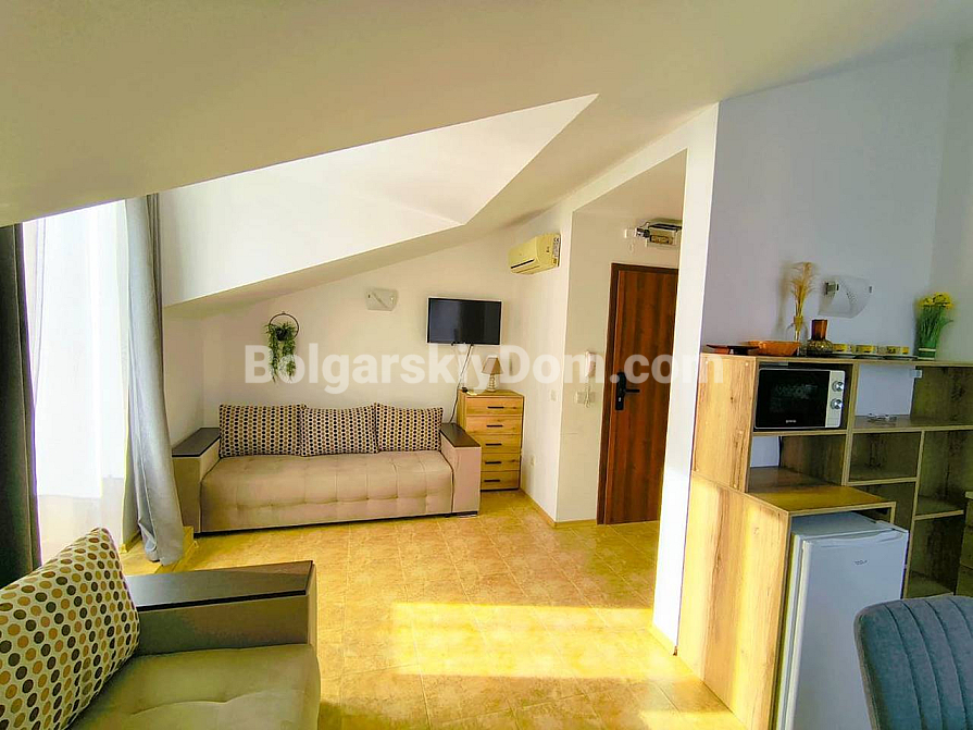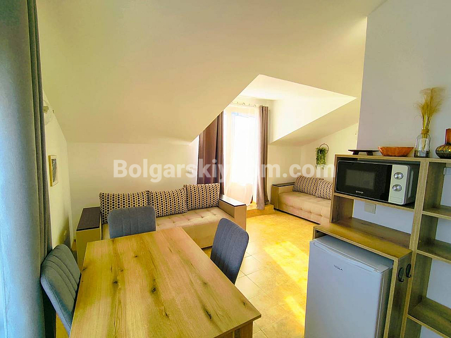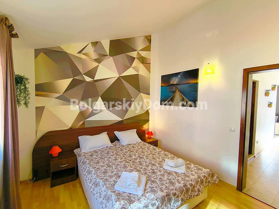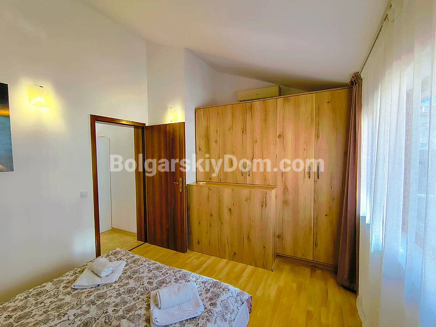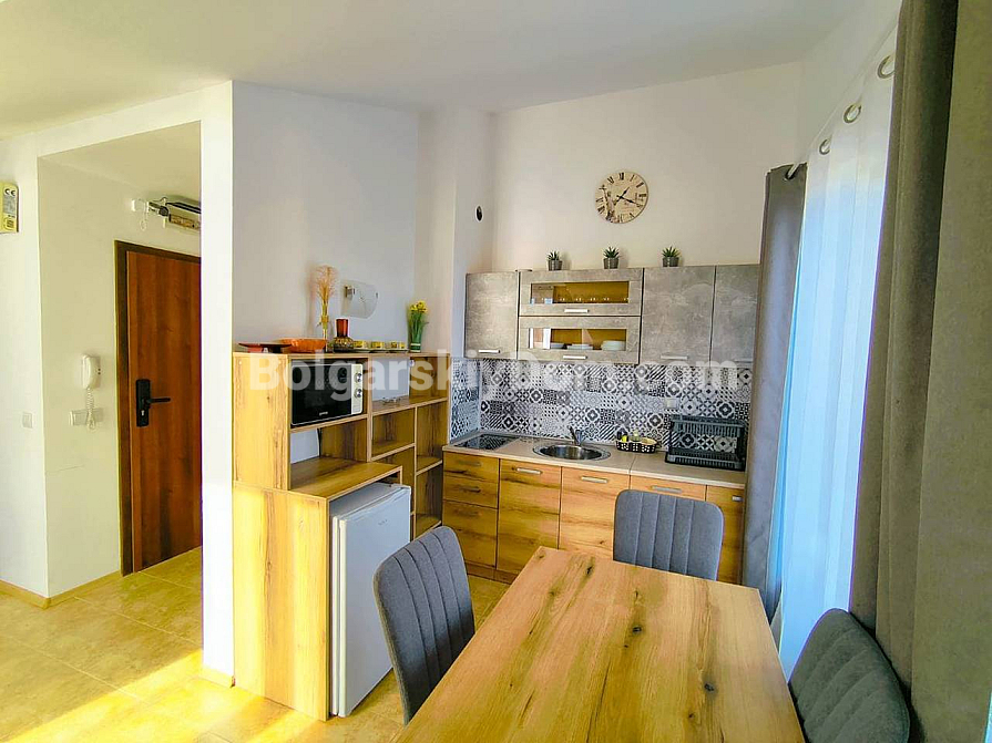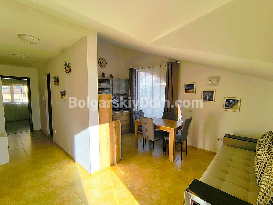 Wśród nowych ofert Bolgarskiy Dom pojawiło się funkcjonalne dwupokojowe mieszkanie w nowoczesnym kompleksie Morski Far. Ten lokal o powierzchni 63 m² znajduje się na 3. piętrze i stanowi prawdziwy atut: jego układ obejmuje oddzielną strefę kuchenną, co jest niezwykle rzadkie na wybrzeżu i sprawia, że mieszkanie idealnie nadaje się do stałego zamieszkania. Apartament jest całkowicie umeblowany, wyposażony w sprzęt AGD i gotowy do wprowadzenia się. Z tarasu roztacza się przyjemny widok na zielony teren kompleksu.
