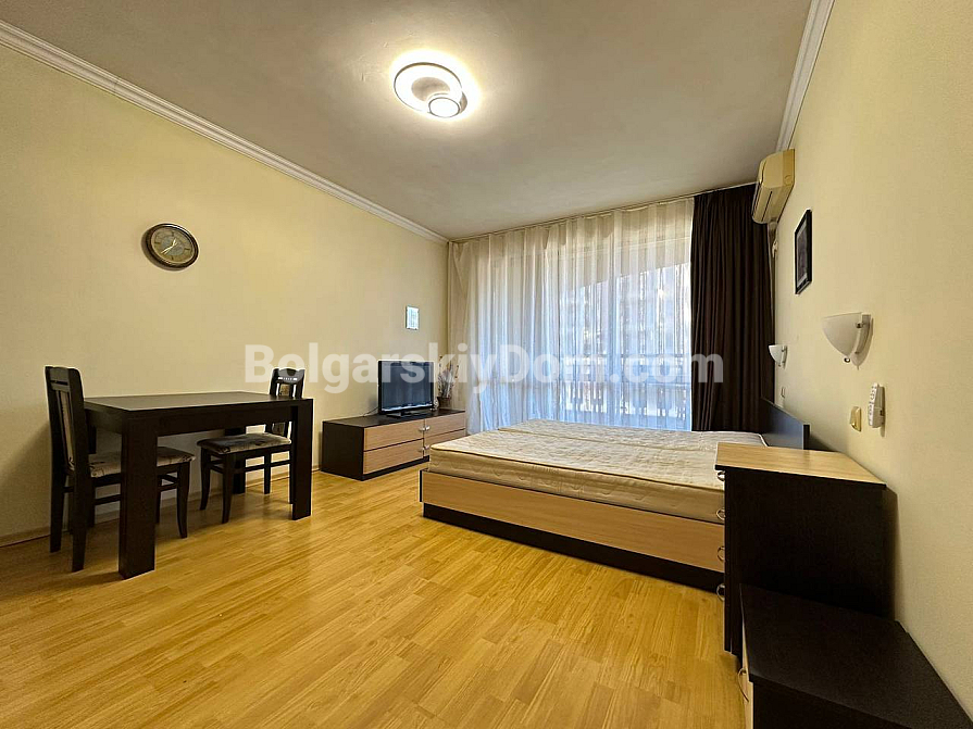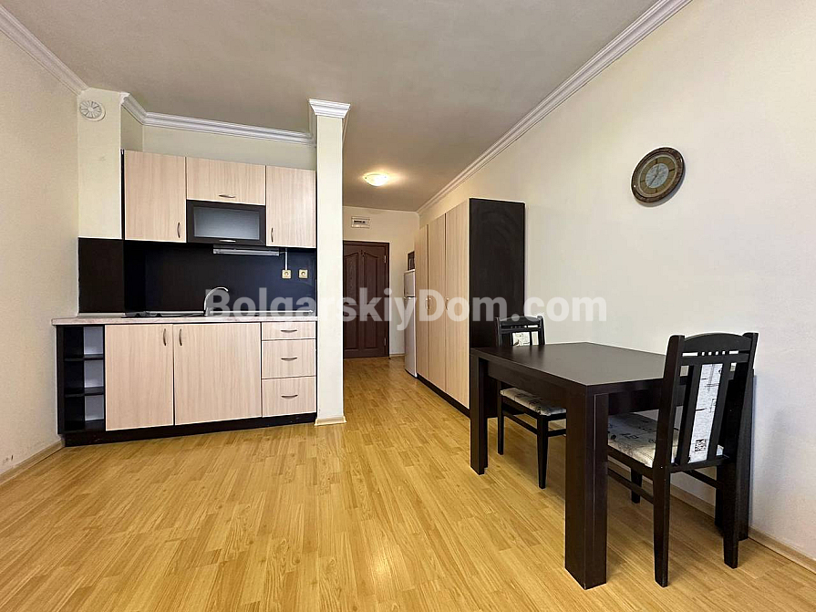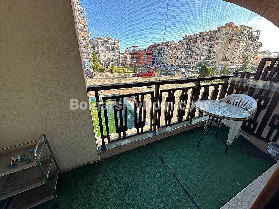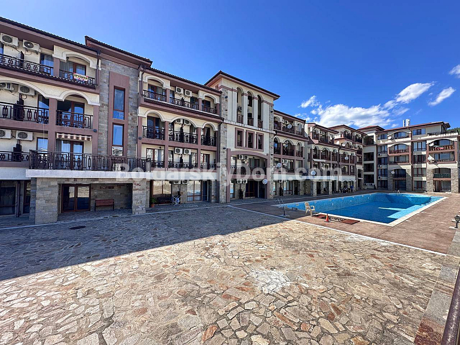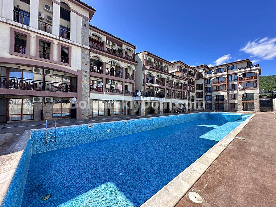 Przedstawiamy atrakcyjny cenowo apartament z w pełni wyposażonym wnętrzem, gotowy do natychmiastowego zamieszkania. Położony w prestiżowym kurorcie Święty Włas, jest to przytulne studio o łącznej powierzchni 49 m². Mieszkanie znajduje się na drugim piętrze i jest skierowane na dziedziniec, z przyjemnym widokiem na basen. W cenę nieruchomości wliczone są już meble oraz sprzęt AGD — optymalny zestaw do komfortowego pobytu sezonowego lub wypoczynku. Dość przestronny taras może stać się idealnym miejscem na śniadania o wschodzie słońca oraz przyjemne kolacje w chłodnym cieniu.