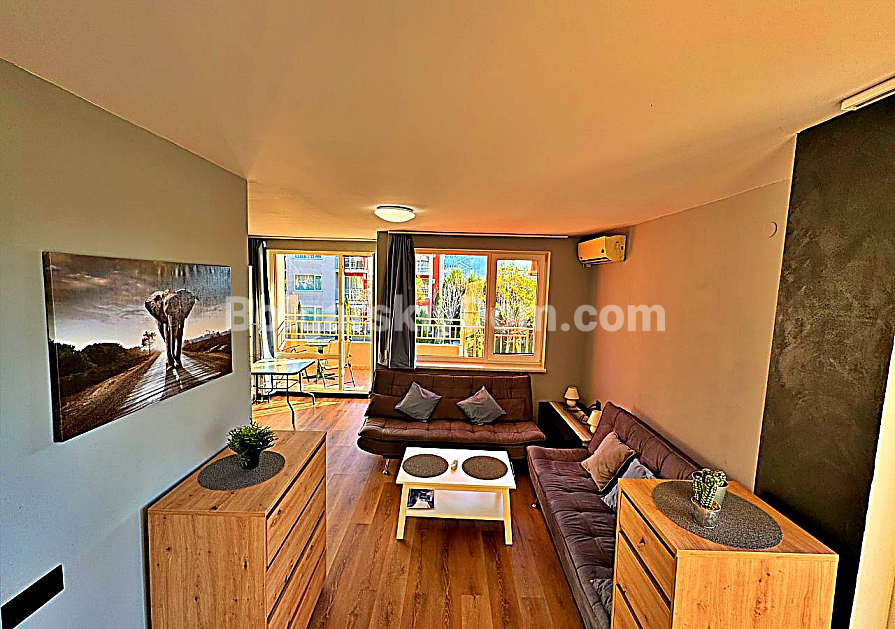 Przedstawiamy świeże uzupełnienie katalogu agencji nieruchomości Bolgarskiy Dom — naprawdę przestronną kawalerkę w popularnym, rodzinnym kompleksie Nessebar Fort Golf Club! Z uwagi na powierzchnię 54 m², mieszkanie przypomina nowoczesny apartament jednopokojowy, co daje znacznie więcej możliwości aranżacji przestrzeni. Studio znajduje się na pierwszym piętrze, co zapewnia szybki dostęp do wyjścia i basenów, a z okien rozpościera się widok na wewnętrzny, zielony dziedziniec. Mieszkanie jest w doskonałym stanie, w pełni umeblowane i wyposażone w sprzęt AGD, więc nie trzeba inwestować czasu ani pieniędzy w urządzenie — można wprowadzić się od razu po finalizacji transakcji. Bardzo płynna i atrakcyjna oferta — czekamy na Twój telefon!