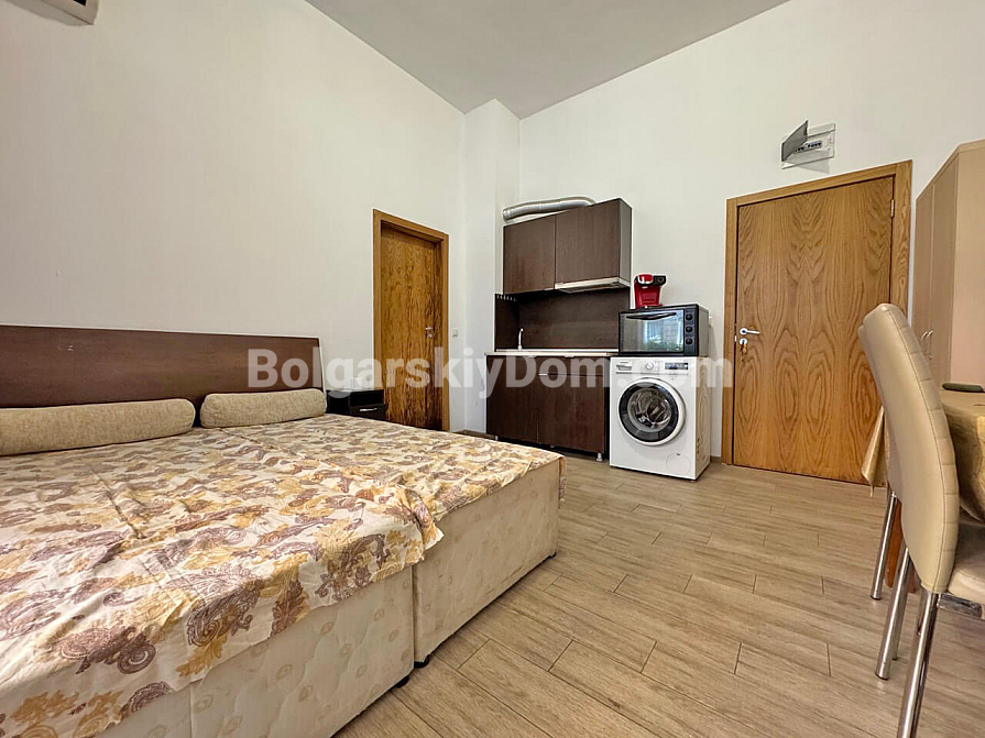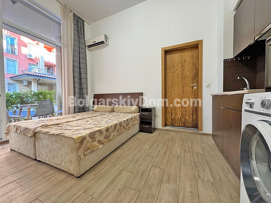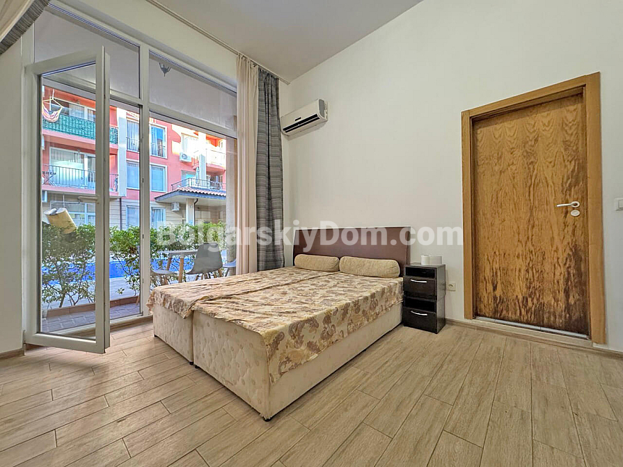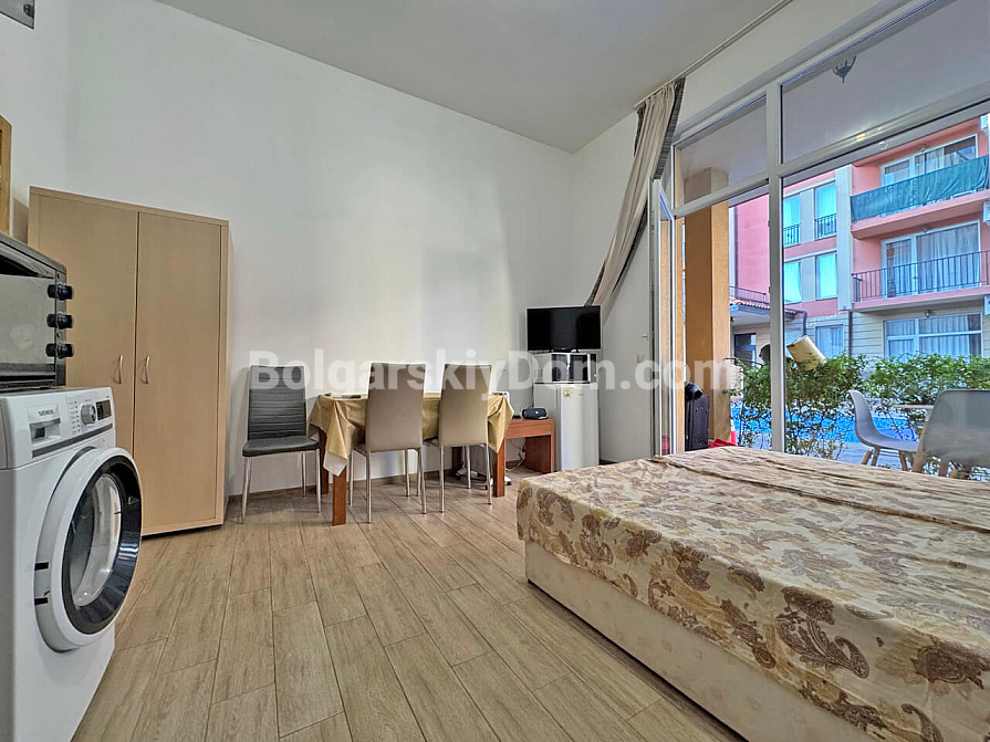 Jasne i funkcjonalne studio o powierzchni 37 m² w kompleksie Sunny View Central w Słonecznym Brzegu to świetna propozycja na komfortowy wypoczynek nad morzem. Apartament znajduje się na 1. piętrze, co zapewnia wygodny dostęp bez konieczności pokonywania schodów czy czekania na windę. Układ mieszkania pozwala wygodnie zaaranżować część kuchenną, miejsce do spożywania posiłków oraz przytulną strefę do spania i wypoczynku. Szczególnym atutem apartamentu jest widok na basen z tarasu, który tworzy przyjemną wakacyjną atmosferę. Dzięki przemyślanemu rozkładowi nieruchomość wydaje się przestronna i komfortowa zarówno do sezonowego zamieszkania, jak i na letni wypoczynek.