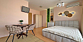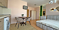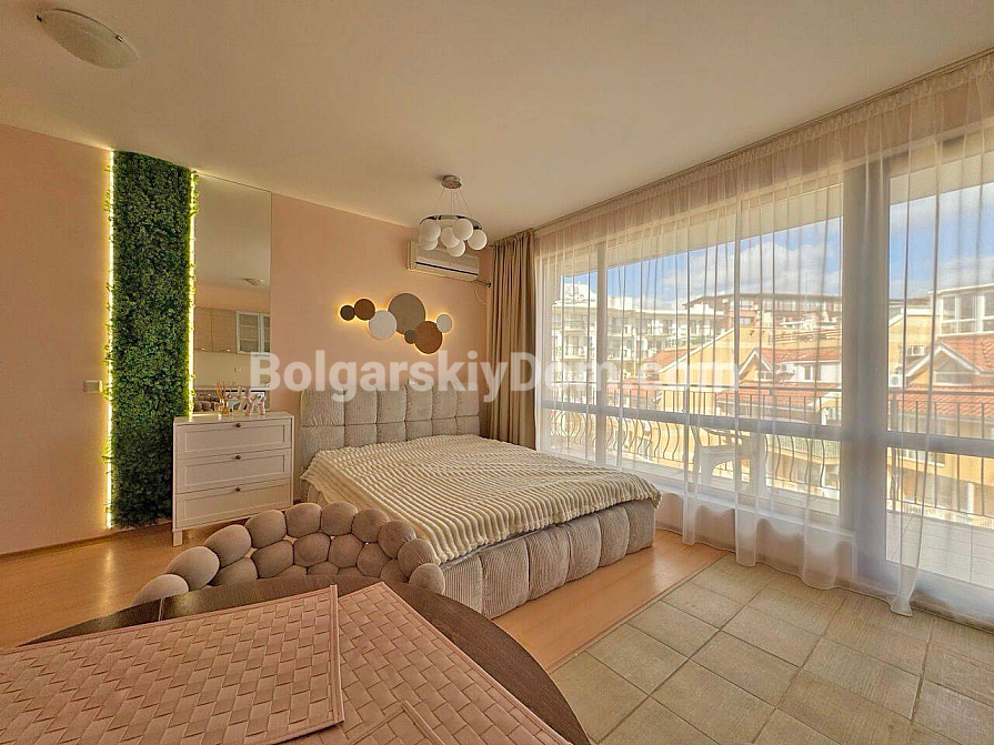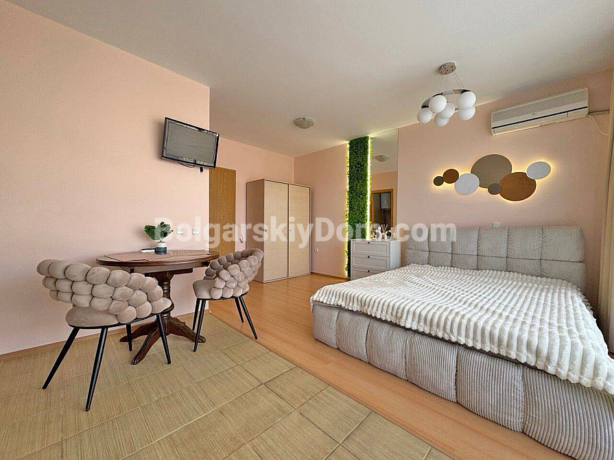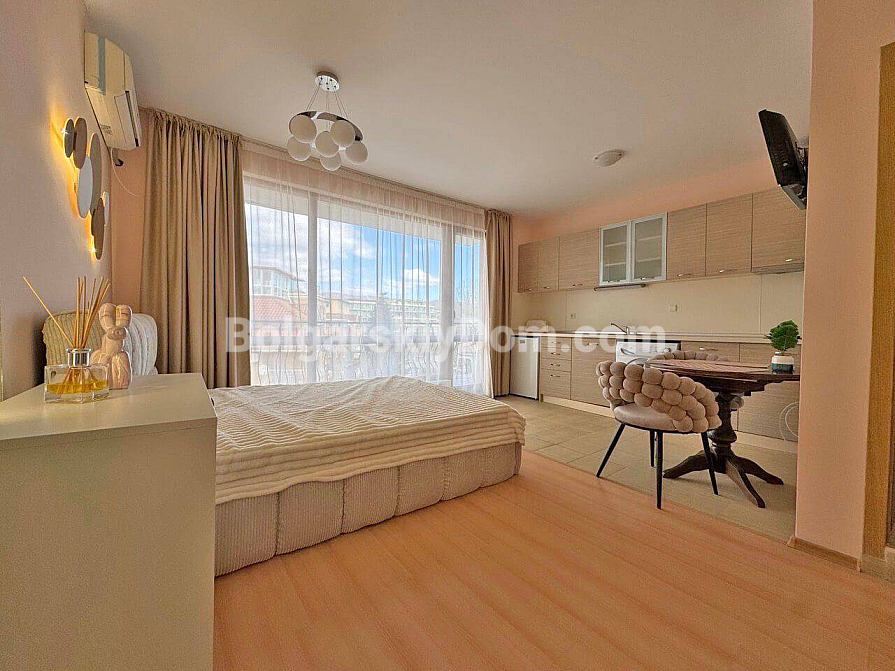 Stylowa i korzystna oferta od Bolgarskiy Dom! Nowoczesne studio w popularnym kompleksie Diamond Bay w centrum Słonecznego Brzegu. Apartament znajduje się na 4. piętrze sześciopiętrowego budynku z windą, o powierzchni 40 m², z otwartym układem: przestronny pokój, w którym harmonijnie połączono strefę kuchenną (z kuchenką, lodówką i szafkami), duże łóżko dwuosobowe oraz strefę wypoczynkową, nowoczesna łazienka z prysznicem, a także przestronny balkon do relaksu z widokiem na kompleks. Studio jest w doskonałym stanie: świeży, estetyczny remont, stylowe meble wysokiej jakości, wszystkie niezbędne urządzenia elektryczne i sprzęt AGD są już na miejscu – można wprowadzić się i mieszkać bez dodatkowych prac!