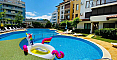 Kompleks Diamond Bay to zamknięte osiedle w spokojnej północnej części kurortu, a jednocześnie z doskonałą dostępnością: duży odkryty basen z częścią dla dzieci, leżaki i parasole do opalania, restauracja z barem, lobby, całodobowa ochrona, monitoring, zadbany zielony teren oraz parking. Roczna opłata eksploatacyjna wynosi jedynie 8 euro za m² (jedna z najniższych w okolicy dla kompleksu z basenem i pełną infrastrukturą). Do piaszczystej plaży jest około 400–450 metrów pieszo, w pobliżu znajdują się supermarkety (w tym Lidl), targ, apteki, kawiarnie oraz przystanki transportu – cała infrastruktura kurortu w zasięgu spaceru. Aby zarezerwować prezentację i omówić cenę, napisz do nas!
