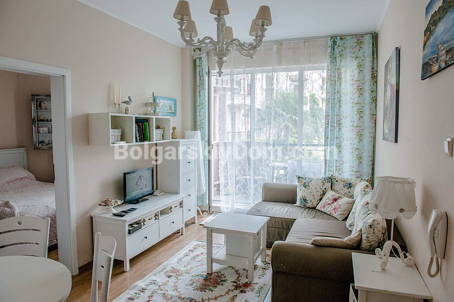 Продается двухкомнатная квартира с выделенной кухонной зоной и стильной меблировкой. Апартамент расположен на партерном этаже, вид на бассейн. Общая площадь 52,39 кв.м.