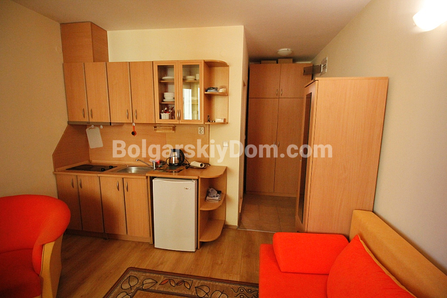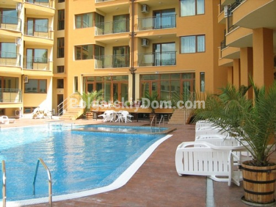 Квартира расположена на втором этаже. Общая площадь 30 кв.м. В доме есть лифт. На территории есть бассейн, парковка. Постоянно дежурит охранник. Комплекс «Амадеус 5» закрытого типа, вход только по чипам. Такса поддержки 6 евро за 1 кв.м. площади, то есть всего 180 евро в год.