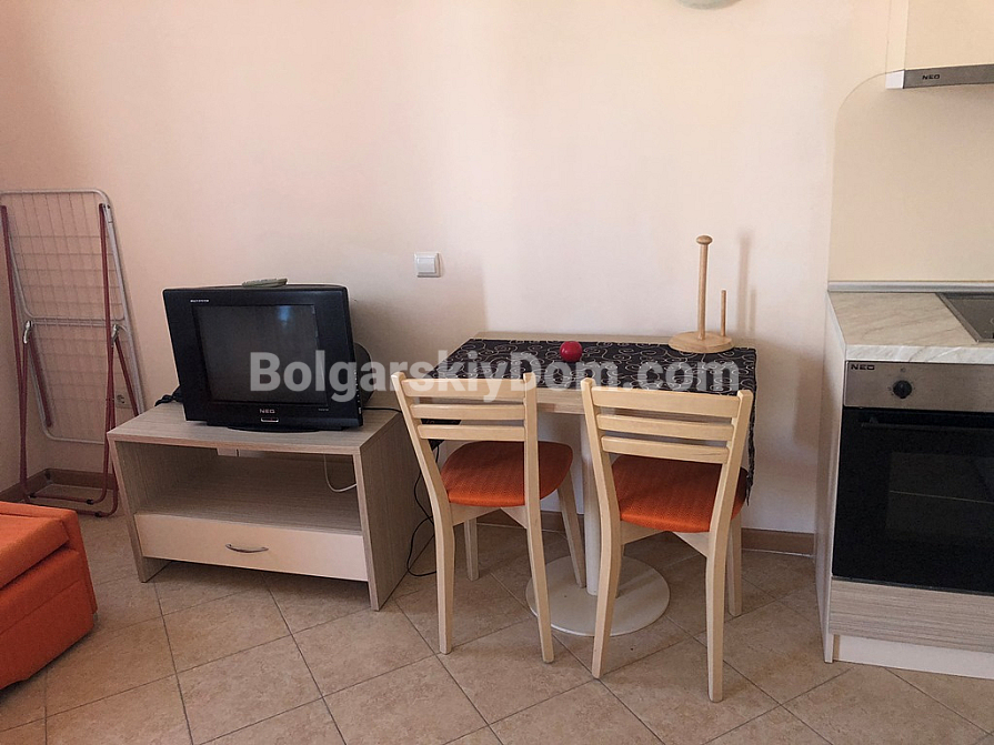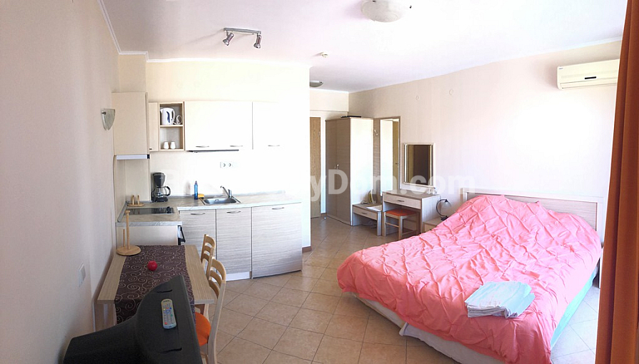 Новинка! Удивительно красивый комплекс Ройал Сан вновь открыт для соискателей выгодных предложений на курорте Солнечный берег! Продается отличная и полностью меблированная квартира-студия площадью 33 кв. м. Апартамент на третьем, не последнем этаже, а из его окон простирается вид на невероятно эстетичную внутреннюю территорию апарт-отеля. Есть большой балкон в венецианском стиле с садовой мебелью для отдыха. В санузле есть небольшая ванна, все оснащение остается после продажи для будущих владельцев.